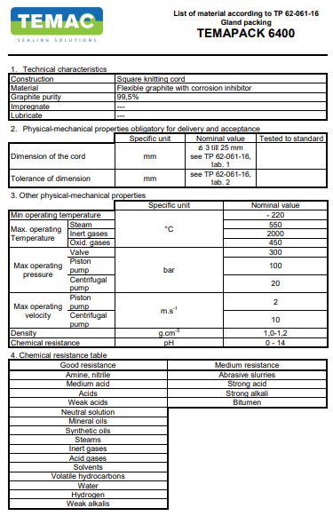 Các đặc tính dây tết chèn gland packing temapack type 6400: