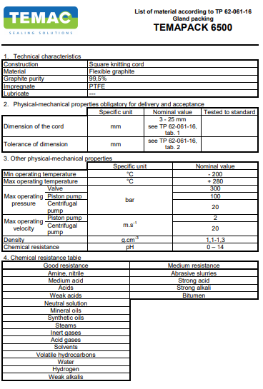 Các đặc tính dây tết chèn gland packing temapack type 6400: