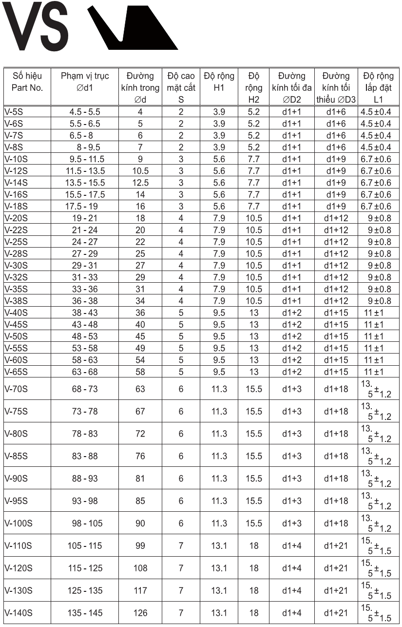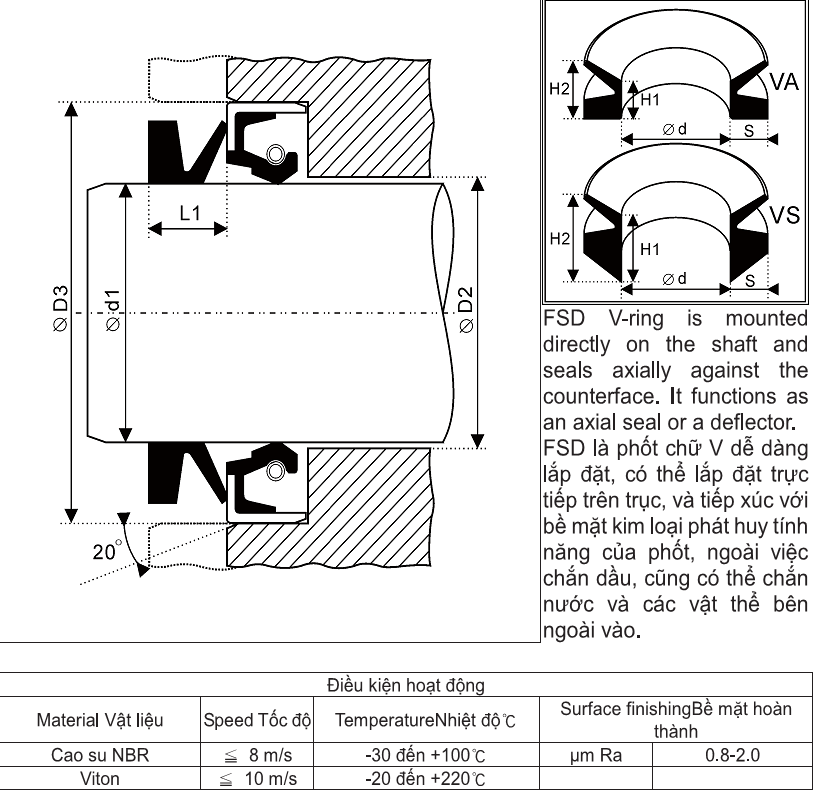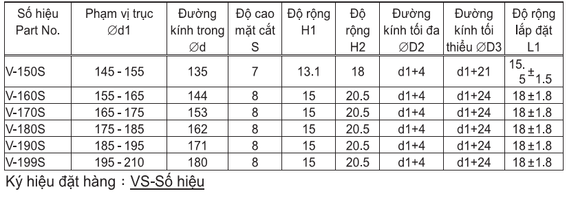 Dưới đây là hình vẽ vị trí lắp đặt V RING VS, các thông số kích thước, đường kính trong, đường kính ngoài, bề rộng, biên dạng V RING, vật liệu NBR, VITON, tốc độ...vv. Chi tiết vui lòng xem kỹ nội dung bên dưới: